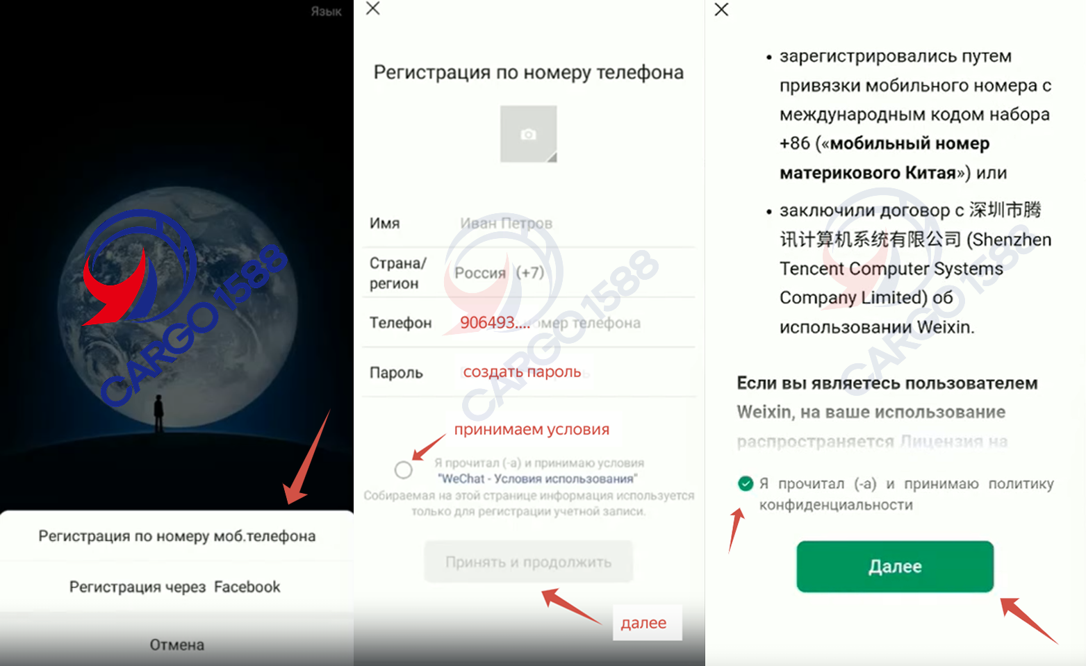 Запускаем программу и нажимаем "Регистрация по номеру телефона". Вводим имя, номер телефона и пароль, выбираем страну. Ставим галочку - тем самым