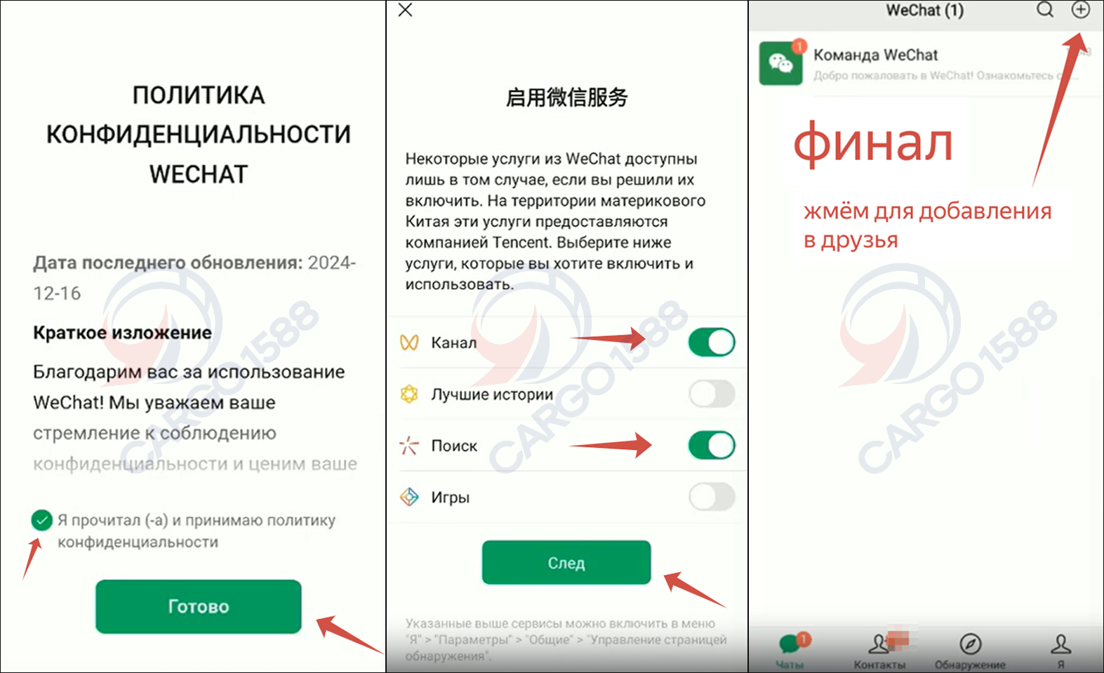 Чтобы добавить нас в свои контакты, зайдите в WeChat, перейдите в раздел "Чаты", коснитесь символа "⊕" в верхнем правом углу экрана, выберите