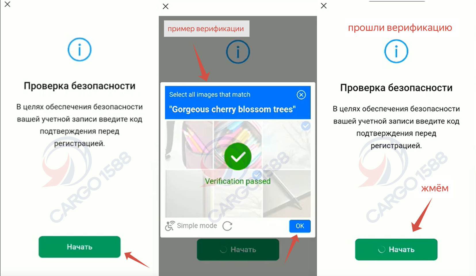 Следующее окно — «проверка безопасности». Прежде чем нажать на кнопку «начать», если вы не знаете английского языка, откройте переводчик. Потому что в следующем окне регистрации в WeChat вас попросят пройти капчу. В нашем случае нужно выбрать изображения цветущих деревьев.